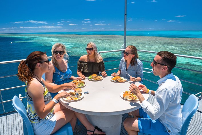 Offering a range of relaxing spaces, from sun decks to undercover seating and tables, Heart pontoon is the ideal place to set yourself up for a day of fun in one of the most beautiful places on the planet. Access to air-conditioned luxury and freshwater showers and change rooms, ensure optimum comfort on your cruise.