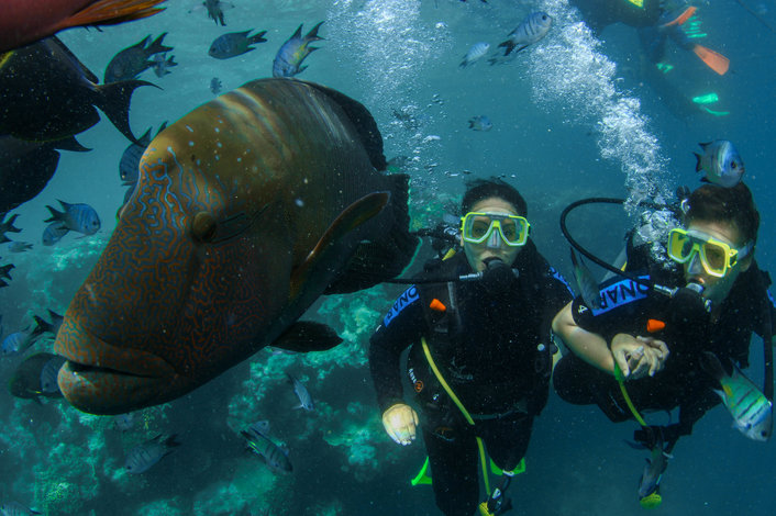 Located in a protected bay adjacent to a coral wall, Heart Pontoon is perfectly situated for you to swim, dive or snorkel among schools of colourful fish and other marine life endemic to the Reef. All snorkelling gear is provided, including sterilised mouthpieces. Our friendly staff are happy to offer basic tuition for beginners and flotation devices are on hand for those who feel they'd like a little extra support. Wet suits are also provided.