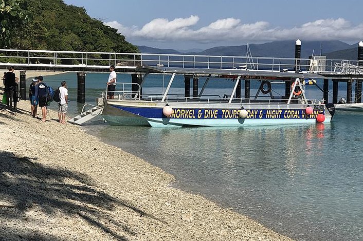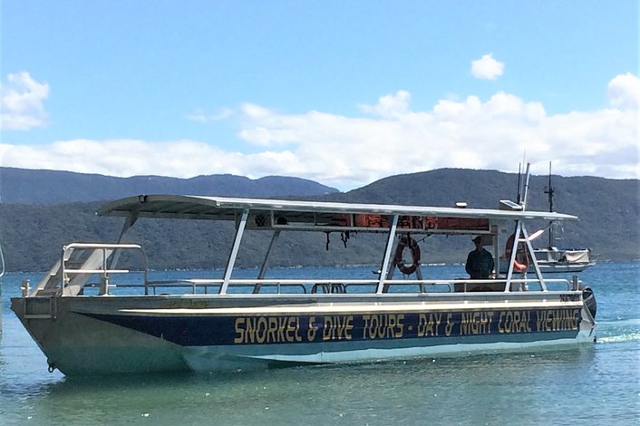 Glass Bottom Boat departs from the beach outside of the Fitzroy Island Dive Adventure Centre.