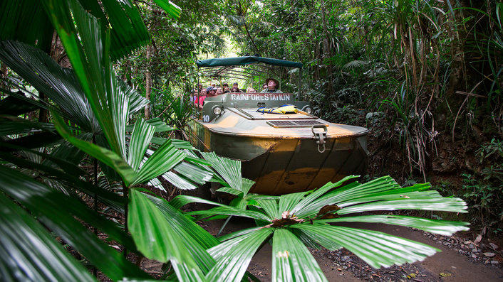 Your experience includes a journey on the historic Kuranda Scenic Railway, before visiting the award-winning Rainforestation Nature Park, where you can take a tour on a historic World War II Army Duck over land and through water. Join a guided tour and see crocodiles, koalas, snakes, dingoes, a cassowary and the only Tasmanian Devils in North Queensland. Handfeed kangaroos and wallabies, and even cuddle a koala (additional cost).