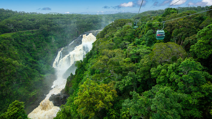 Enjoy a relaxing return to Cairns, travelling on the Skyrail Rainforest Cableway, just metres above the rainforest canopy.